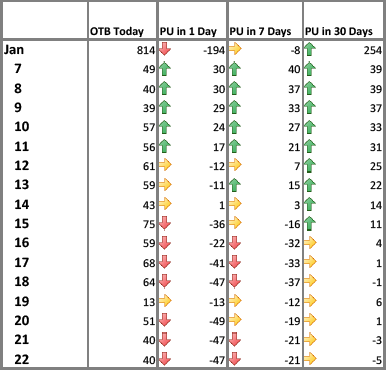 Figure 2: Pickup (PU) analysis for the next 15 days, showing business on the books (OTB) today, along with pickup since yesterday, seven days ago, and 30 days ago.
